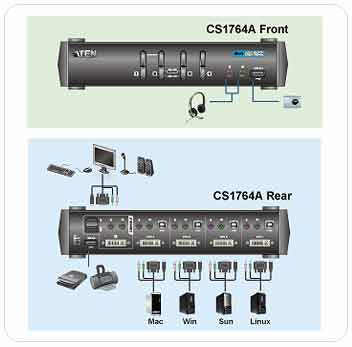 CubiQ CS1764A USB 2.0 DVI KVMP除了同時結合4埠KVM多電腦切換器與2埠USB 2.0 Hub之外,並提供支援數位螢幕(DVI)的介面。CS1764A 具備ATEN先進的螢幕動態同步顯示Video Dynasync技術,可保持最佳螢幕顯示解析度,同時支援電源開啟偵測功能,若其中一台電腦電源關閉,CS1764A會自動切換至下一台電源開啟的電腦。在KVM多電腦切換器功能面,其可讓使用者透過單一USB鍵盤、USB滑鼠及螢幕控制端操作4台電腦。而在USB 2.0 Hub方面,每台電腦可依次存取任何一台連接至Hub的周邊設備。