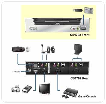 CubiQ CS1792 USB 2.0 HDMI KVMP整合2埠KVM多電腦切換器及2埠USB 2.0 Hub,該兩款產品支援2台電腦之間或是其它設備如遊戲機的HDMI訊號切換,並讓使用者從單一控制端分享USB周邊設備。CS1792提供先進的獨立切換功能,使用者可透過前端面板按鍵及鍵盤熱鍵進行功能切換,該兩款產品同時具備螢幕動態同步顯示技術(Video DynaSync technology),可保持最佳HDMI螢幕顯示解析度。CS1792整合數位音訊功能,可讓使用者體驗高清晰度音效,例如Dolby True HD及DTS HD Mater Audio。