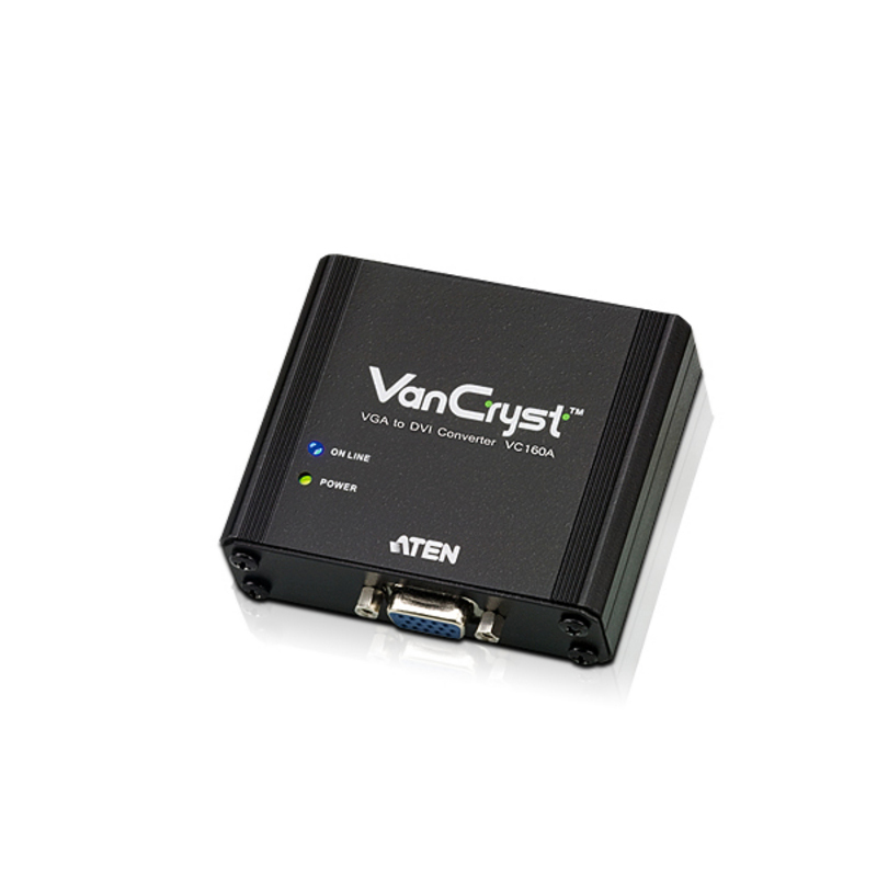 VC160A可將採用VGA介面的裝置連接至DVI數位螢幕、投影機等顯示裝置。VC160A不僅體積輕巧、功能強大、易於安裝,並支援解析度達1920x1200。此外,使用者透過按鈕,即可方便的儲存與選擇畫面的設定。