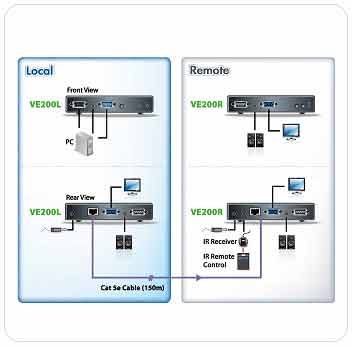 VE200影音訊號延長器能夠延伸電腦系統與顯示螢幕之間的連線距離,在傳輸距離高達150公尺時,視訊解析度可達1600 x 1200@60Hz。傳輸距離達2000 公尺時,解析度可達1280 x 1024 @ 60Hz。近端傳輸裝置(VE200L)與遠端接收裝置(VE200R)是透過Cat 5e雙絞線材連接,以延伸訊號傳輸距離。