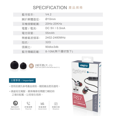 特色 .檢磁型號:BH002 .NCC:CCAM17LP1384T0 .通過台灣NCC協會認證。 .產品已投保3千萬責任險。 .藍牙4.2版晶片,部分智慧手機可支援藍牙耳麥電量顯示。 .磁吸設計,不使用時可互相吸附防止脫落。 .音樂播放與通話模式自動切換。 .具通話 / 來電接聽 / 調整音量 / 上下選曲 / 播放與暫停 . / 相機自拍...等功能。 .加贈2組耳套(大.小),可依使用狀態調整替換。 .中英文語言切換 .藍牙電量顯示 .※請勿連續充電超過3小時,以免內建電池損壞。